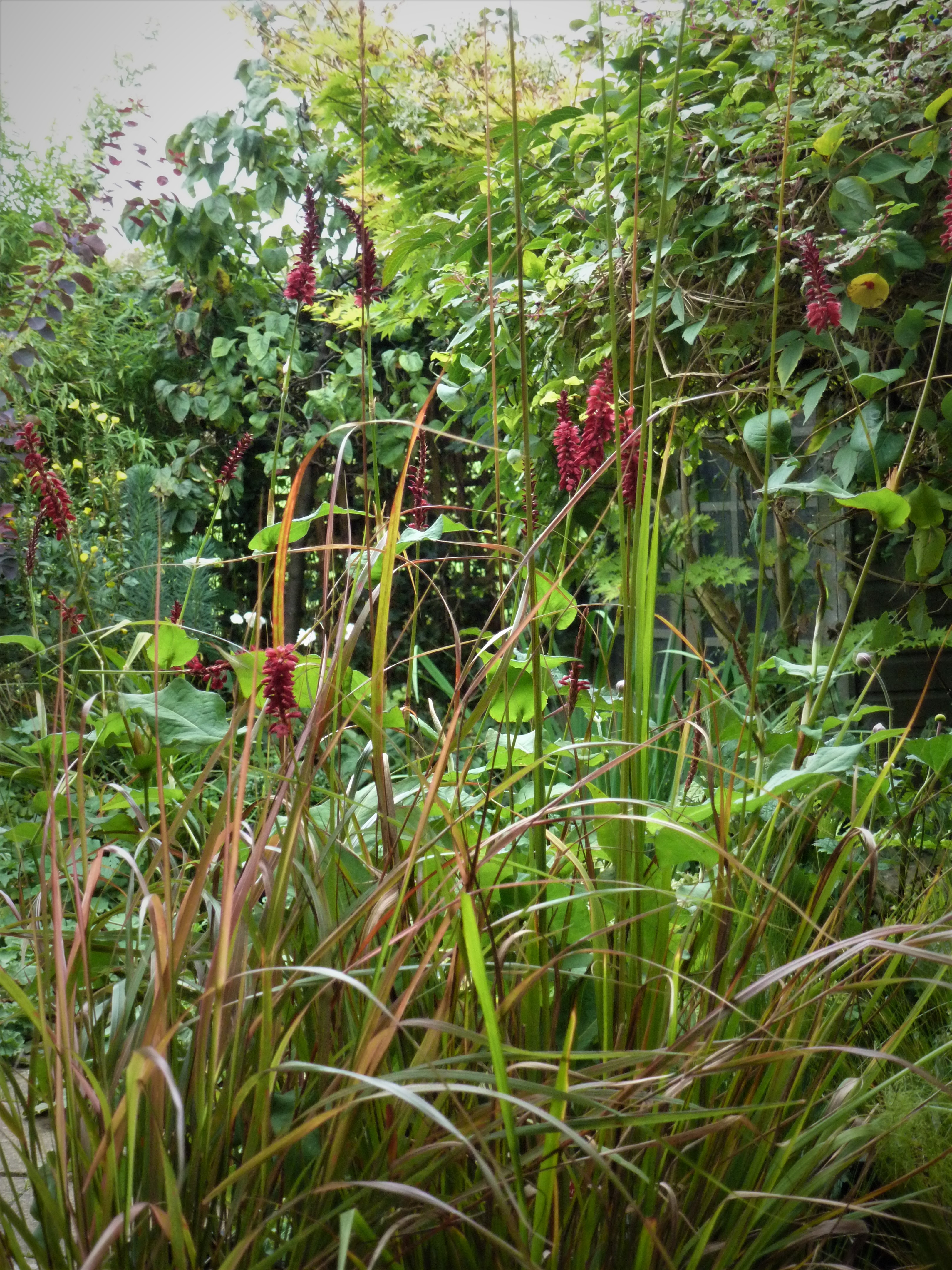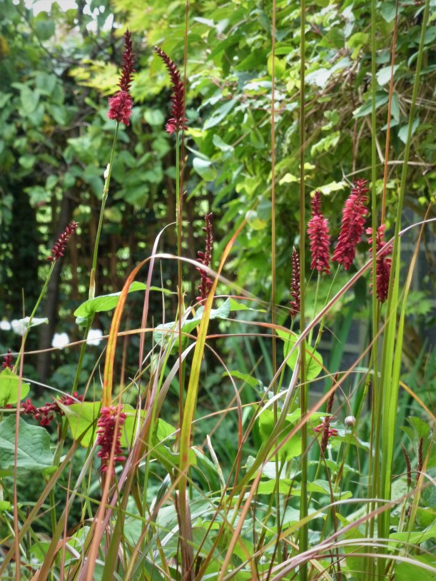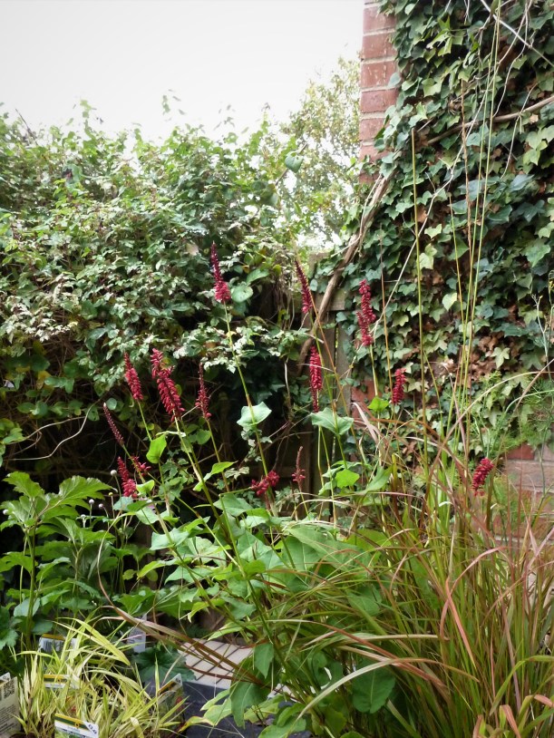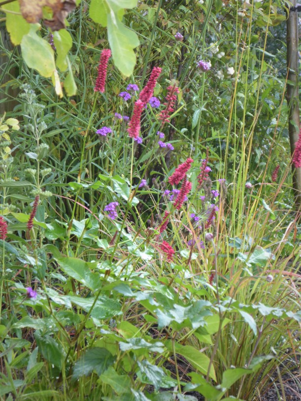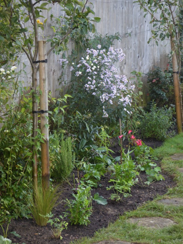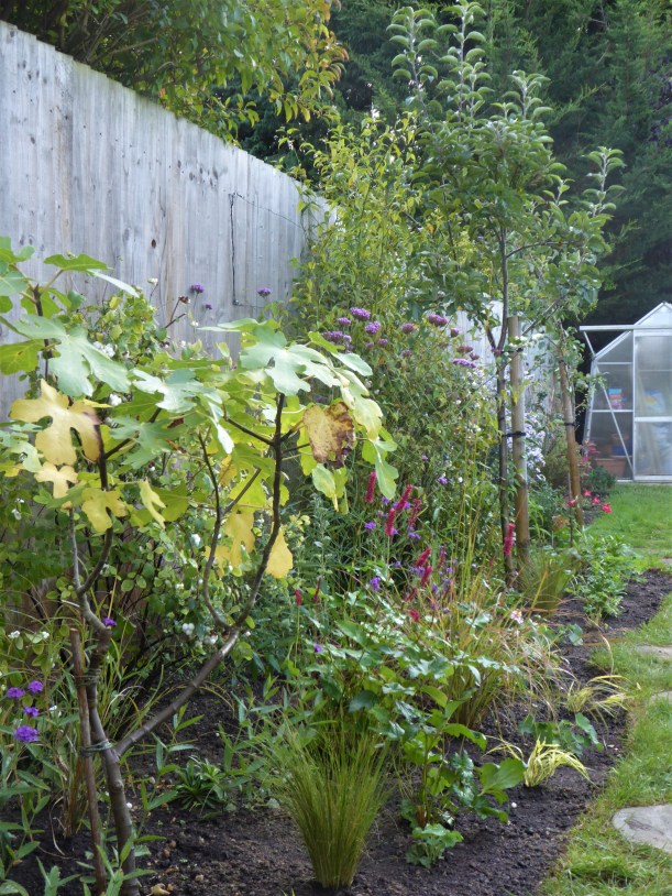 Six months on, and a lot of hard weekly work later, and we now have an ordered bed. Trees are now properly staked and supported, the soil is massively improvement, worthy shrubs have been retained and pruned, weeds and general detritis and failing plants have been removed, and a mass of new planting has been carefully planted up, including many ornamental grasses and good hard-working perennials like japanese anemones, hellebores, hardy geraniums, persicaria and verbena bonariensis. It’s beginning to look like a real garden at last…..