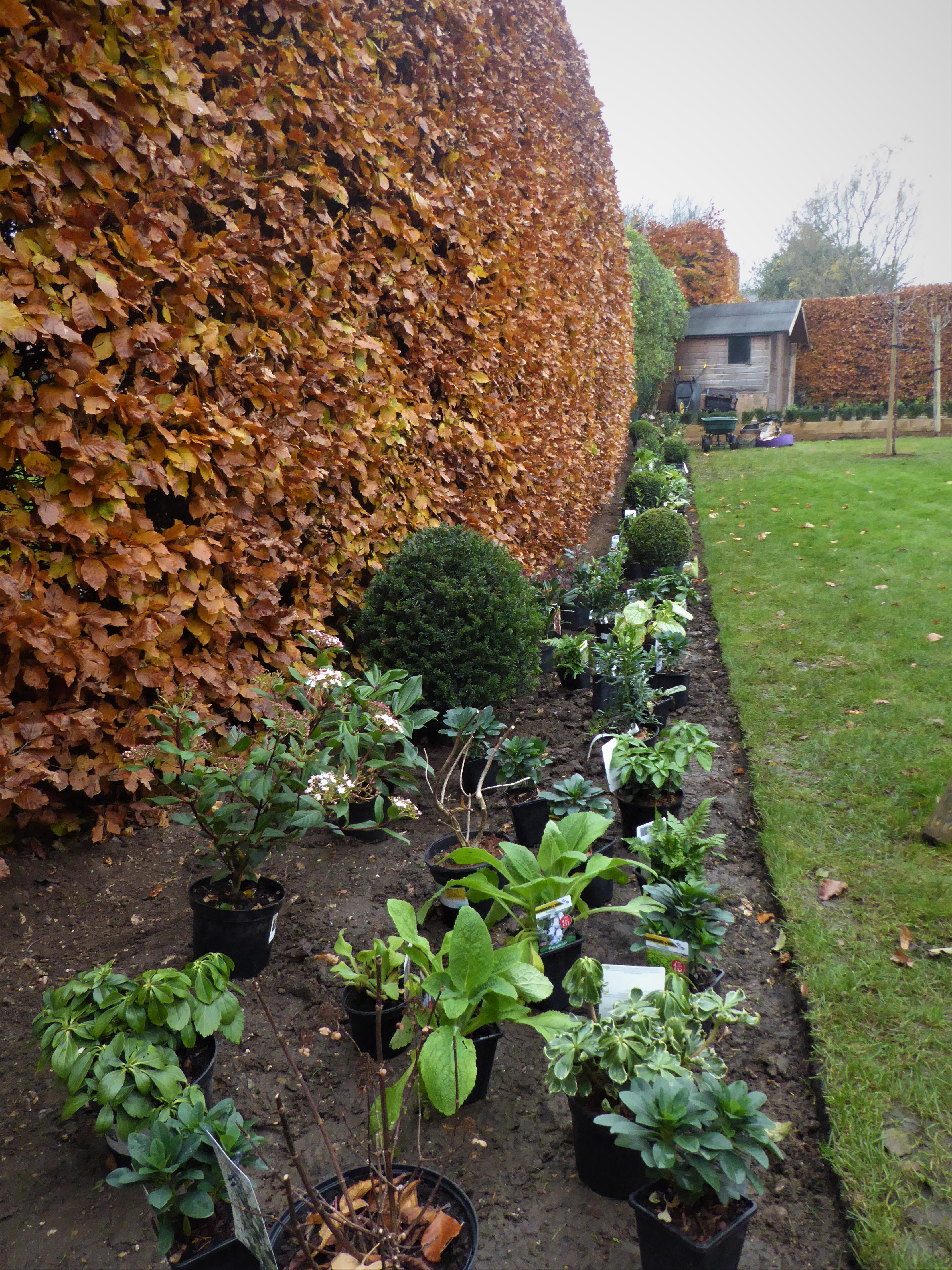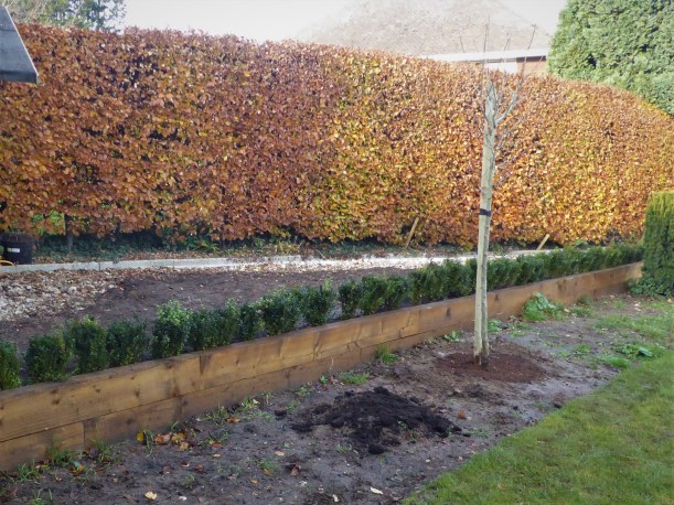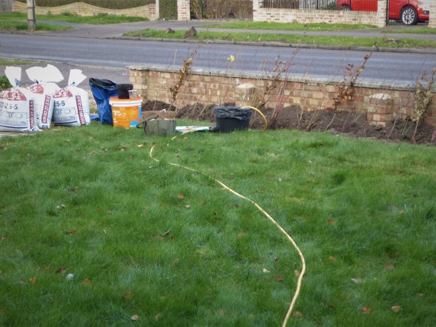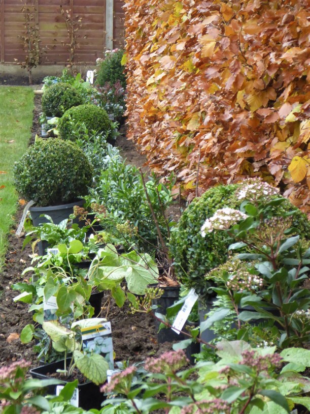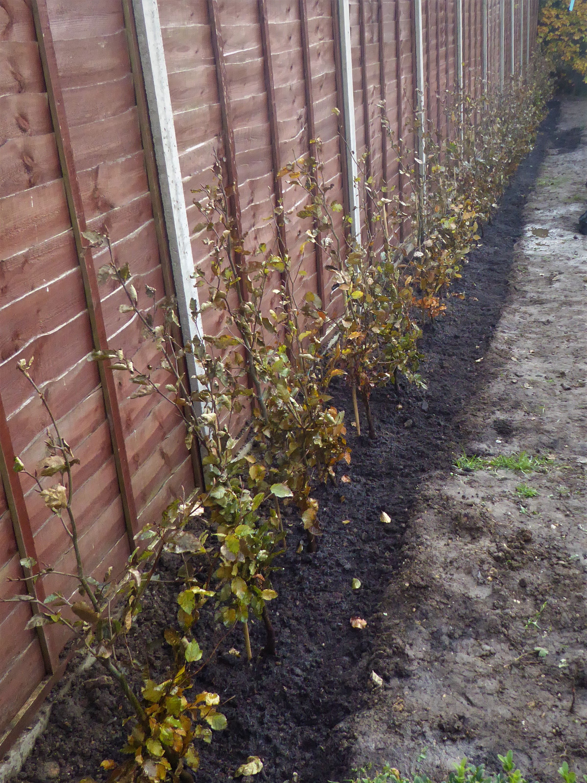 This is the hedging set out for planting in the pre-prepared trench, in temperatures close to freezing this morning (there was even a few specks of snow falling at one point)….