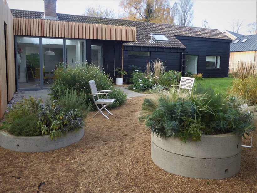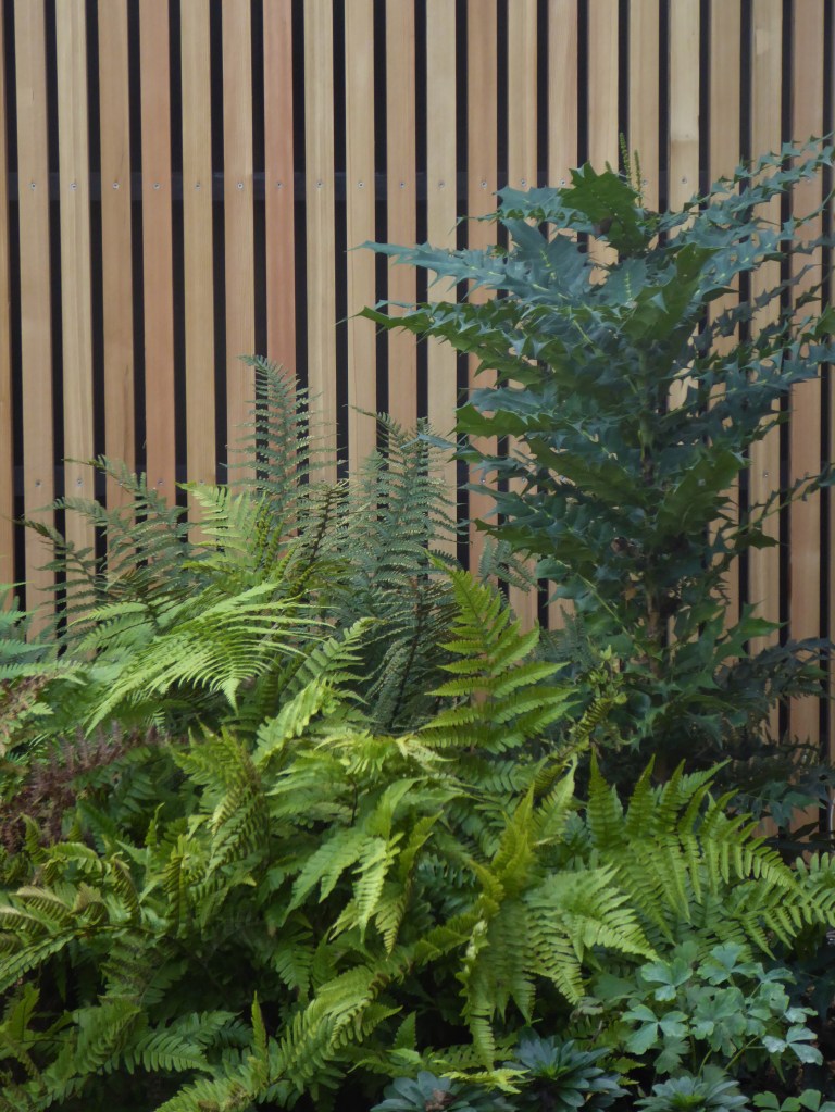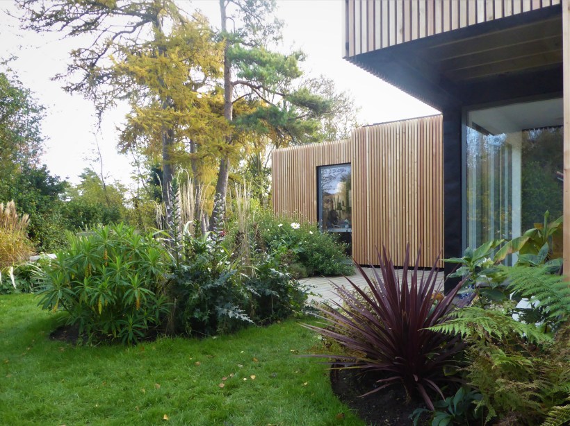 Today I have been tending plantings at my Architect clients. The very contemporary plantings, with lots of very strong shapes and sharp evergreen silhouettes, designed to look good all year round, is now beautifully off-set by the new wooden cladding on the studio, in natural wood and black.