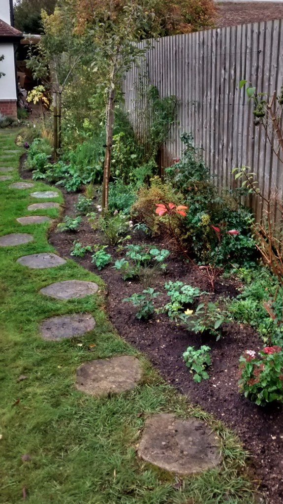 Meanwhile the new bed at another Client’s garden is complete, following the line of stepping stones at last.