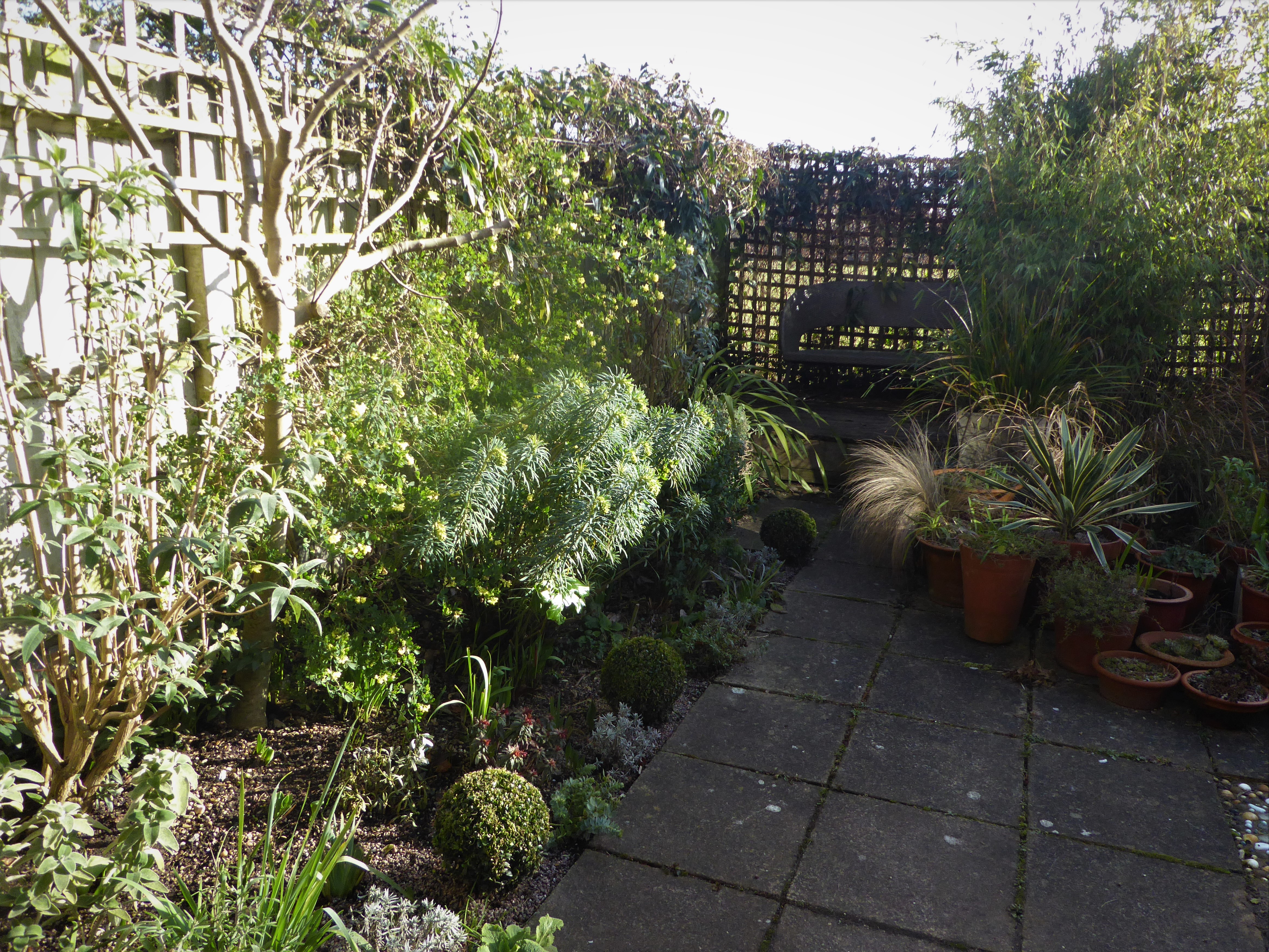 This winter has been cold, plenty of rain, and plenty of gloriously crisp and sunny days, like this one above in my own garden. Many winter highlights which give colour and evergreen backbone to the garden at this timeof year – lovely silvery Astelia….
