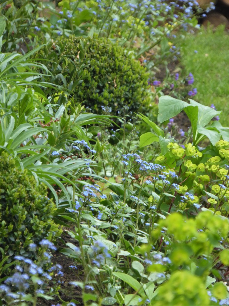 And now looks like this, with box balls, Brunnera and Euphorbias, ferns and Pulmonarias, (and a new screening to hide the shed and the ‘backstage’ elements of garden storage), all establishing nicely…