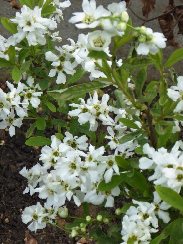Exochorda x macrantha ‘The Bride’ getting established and flowering well.