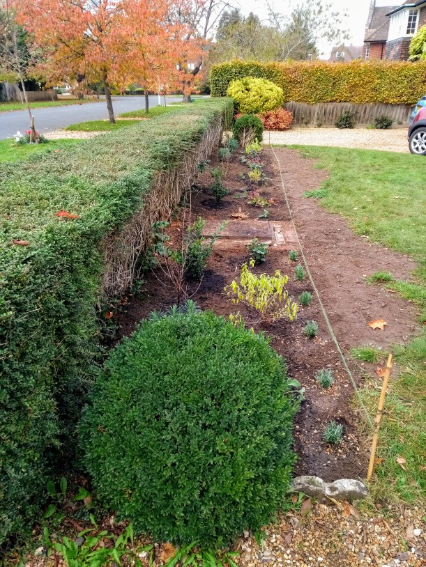 (Below – New client’s front garden bed newly planted behind established Lonicera nitida hedge – again watch this space to see the yellow/blue border come together in the new year.
