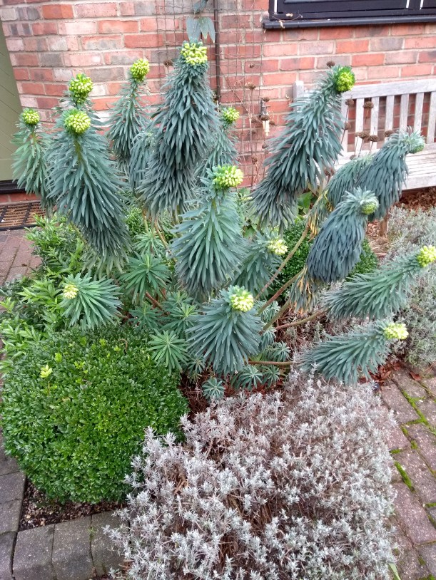 Euphorbia characias wulfenii ‘lion’s mane’ heads doing their rather wonderful winter thing in my front garden..