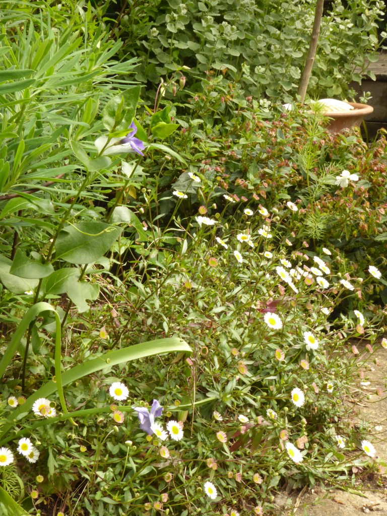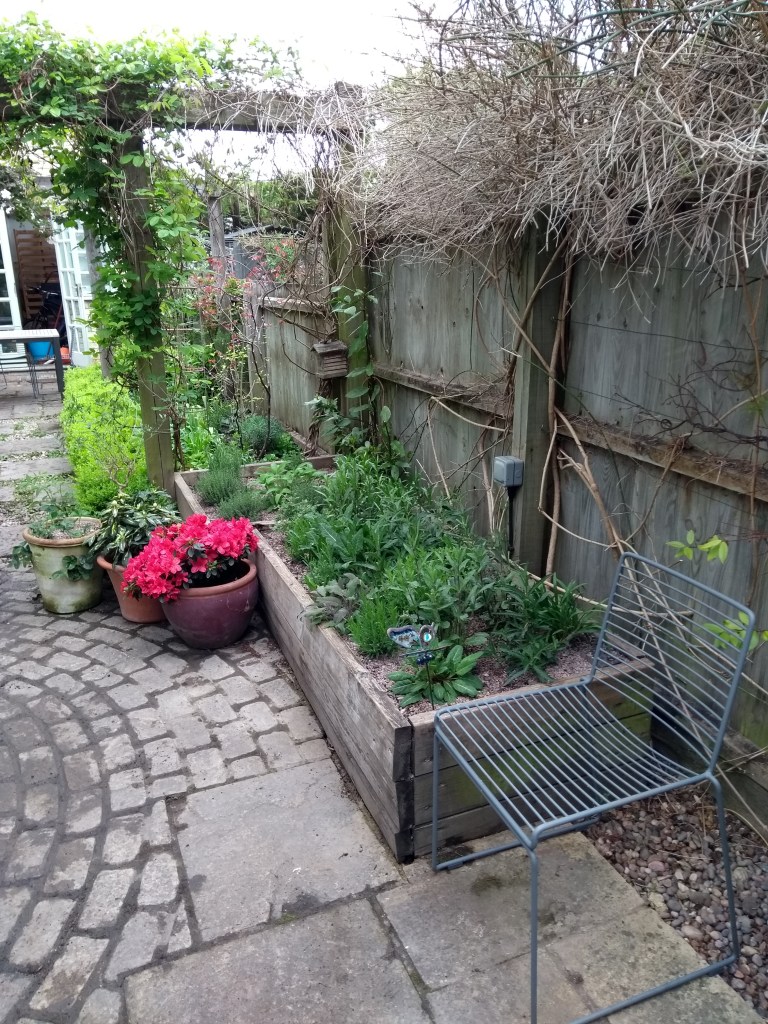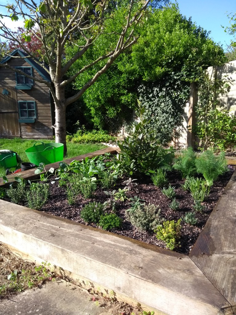 Now transformed into a raised herb bed you can sit next to – southfacing, filled with nice gritty compost as a new home for edibles flowers and leaves (Rosemary, Bay, Sage, Fennel, Strawberries, Lemon verbena, Nasturtium, Borage, Pot marigold, Mint, Lavender)