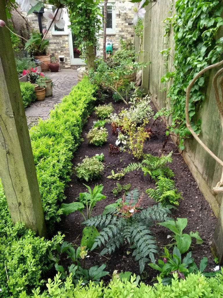 And native English bluebells and Heucheras planted in the shade bed, north-facing, along with Pulmonaria, Epimediums and ferns.