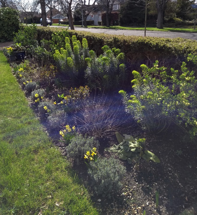 The day before Lockdown I photographed my client’s front garden bed, which was planted last Autumn. Its coming along nicely with the Euphorbia wulfenii and Coronilla complementing each other nicely. This bed is a yellow and blue bed, with Caryopteris, Hypericum, Salvia, Lavender and Phlomis for later in the year. The Lonicera nitida hedge is a nice framing for the plantings, which face the house, and a good deliniation against the pavement.