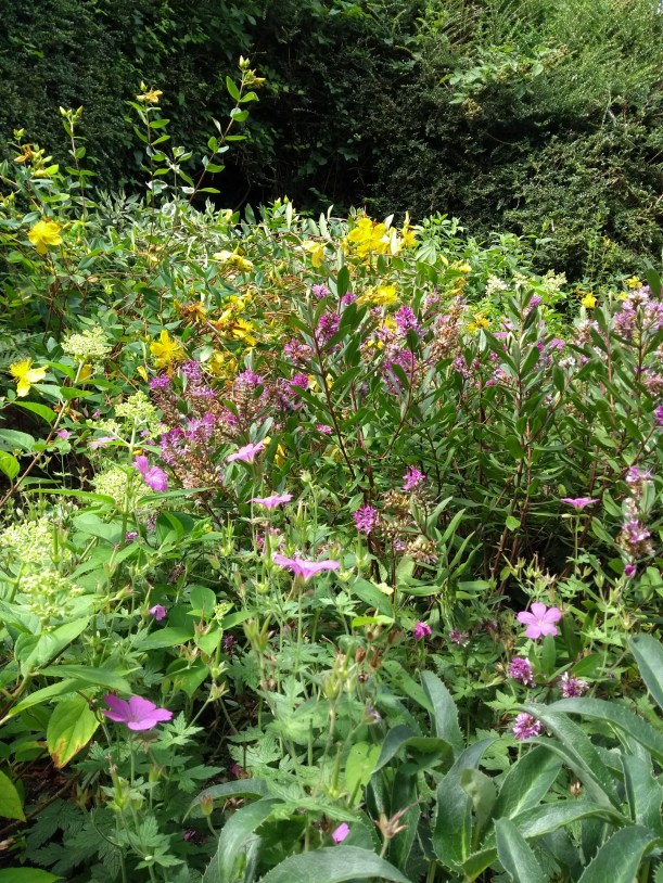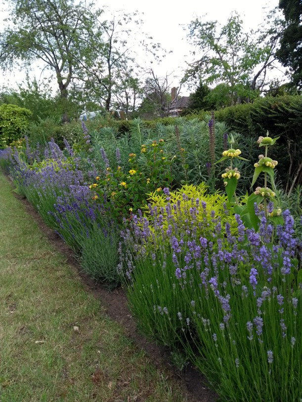 Another border I’m very pleased with above, is now coming to two years old, and the Phlomis, Lavender, Hypericum, Coronilla, Caryopteris and Salvia/catmint palette is knitting together nicely, with a backbone of Euphorbia and Sarcoccoca.
