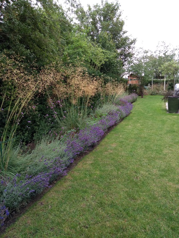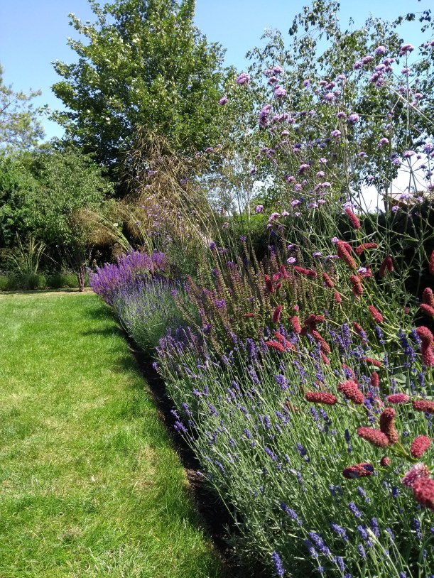 Despite all the difficulties of Lockdown, my clients’ gardens are florishing. Above is a particularly lavishly planted long border containing Salvia, Lavender, Sanguisorbia, Stipa gigantica and Catmint in repetition, used to great effect. A splendid combination for a really high impact summer border. Below are some more shots of the same garden – the long lavender beds, and the grove of silver birch, with an underplanting of a wild flower meadow.