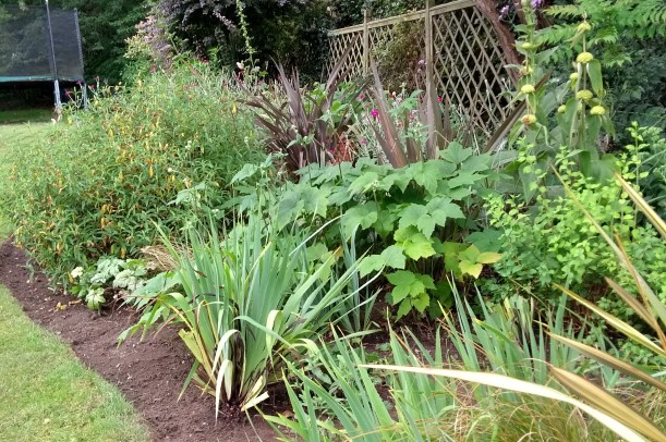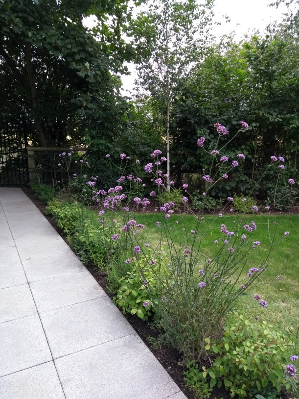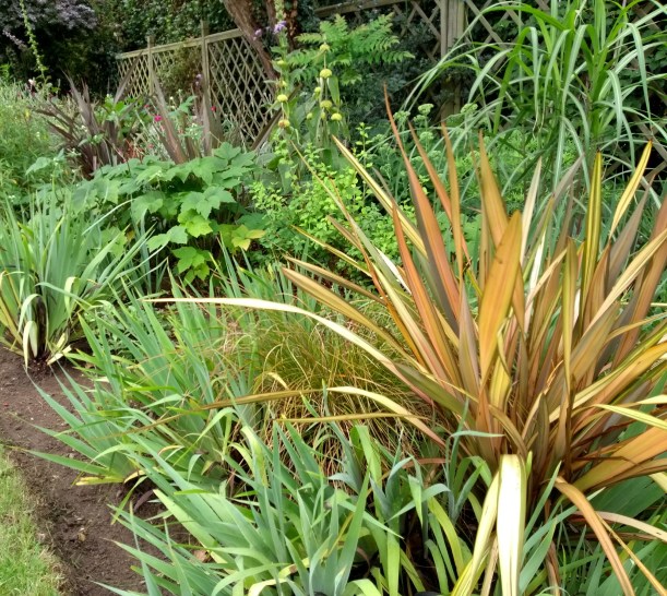 This very large border was empty apart from Sisyrinchium and bluebells when I arrived – it is also coming up to its two years since planting, and beginning to fill out nicely. A solid matrix of Phormium, Cistus, Mahonias and Miscanthus, are joined by nicely spreading swathes of Lychnis coronaria, Phlomis, Achillea, Salvia, Japanese anemones, and hard geraniums.